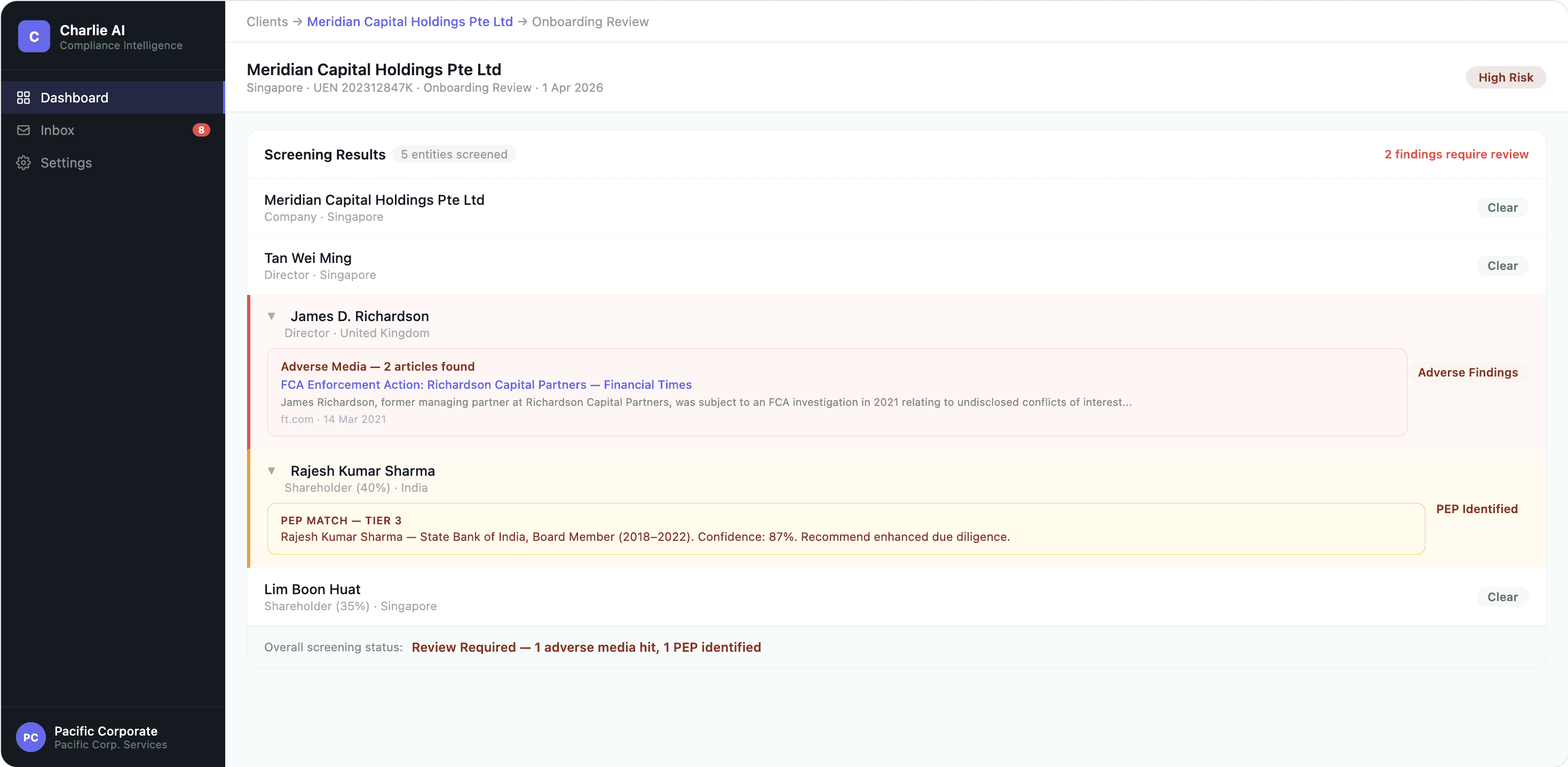 Charlie automatically runs sanctions, PEP, and adverse media checks on every director, shareholder, and UBO — including Panama Papers — the moment you need it. No manual searches. No missed checks.
