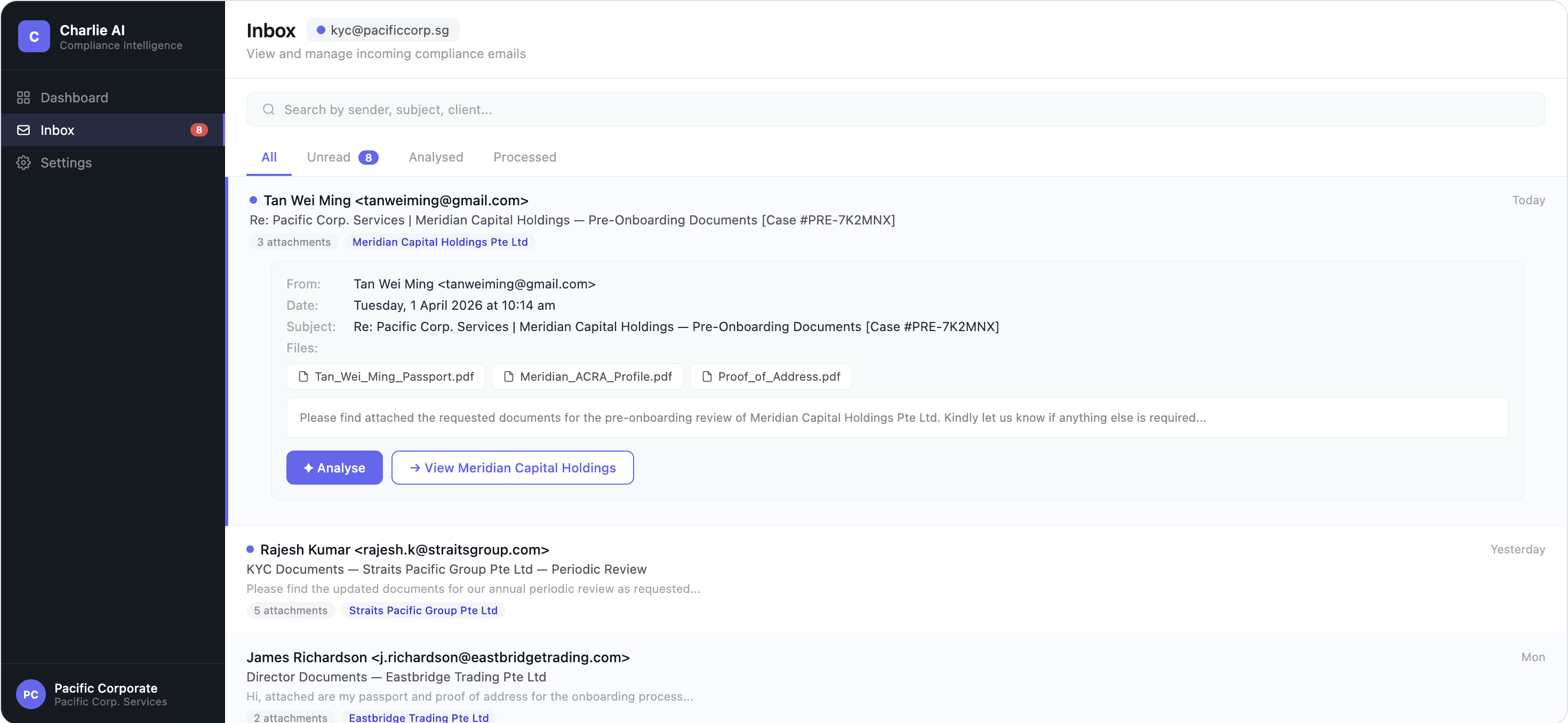 Connect your compliance inbox and Charlie reads, categorises, and extracts data from every attachment automatically. Passports, ACRA profiles, bank statements — all sorted and filed without anyone lifting a finger.